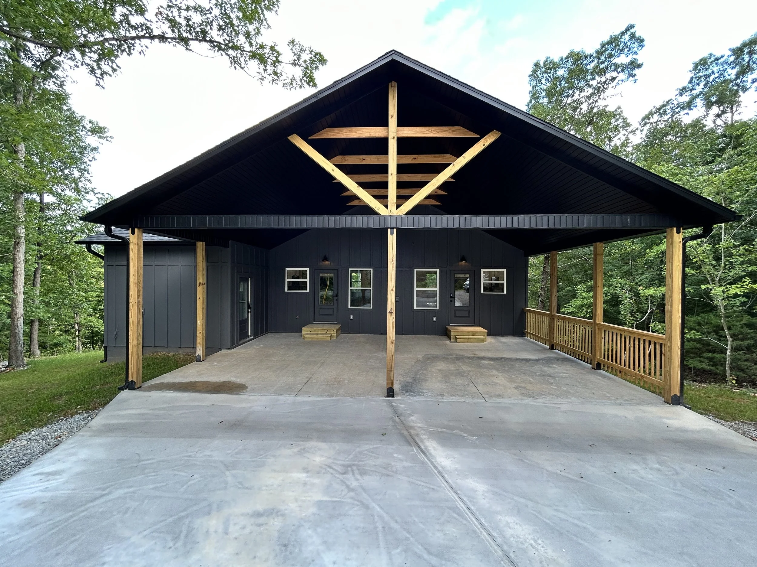 Newly constructed garage with a partially open front, black siding, and wooden supports and railing, surrounded by trees.