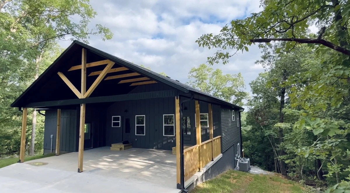 Newly constructed black house with wooden porch and support beams, surrounded by green trees under a cloudy sky.