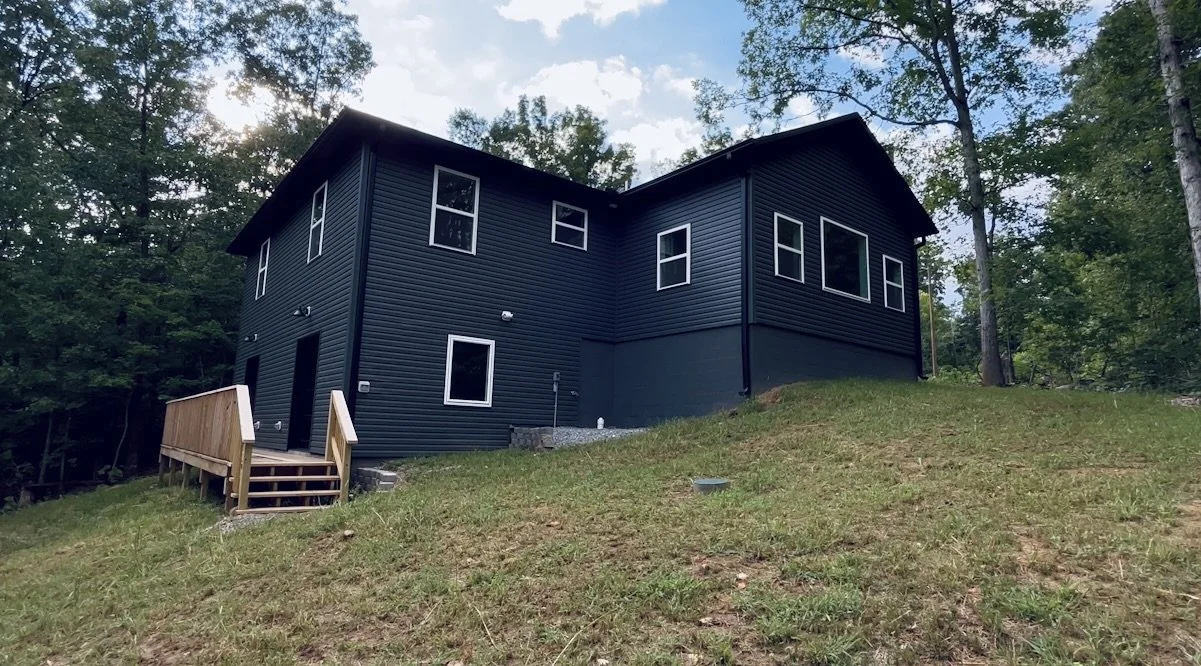 A two-story house with black siding, situated on a grassy sloped lot surrounded by tall trees, with a small wooden deck and stairs leading up to the entrance.